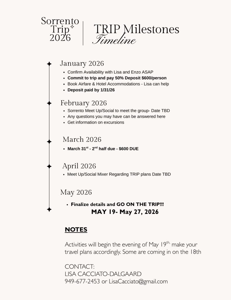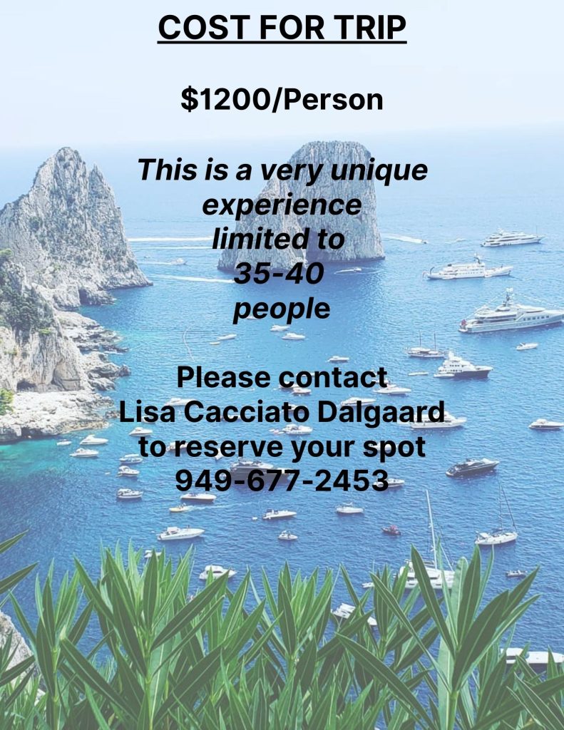 You’ll also have the unique opportunity to travel alongside Dana Point leaders and Sister Cities representatives, including 2026 Dana Point Mayor John Gabbard and his wife Renee, Former Mayor Jamey Federico, Board President Bob Zasa (founder of Dana Point Sister Cities), and board members including Enzo Scognamiglio, owner of Brio Ristorante and an incredible Italian-native ambassador for the group.
